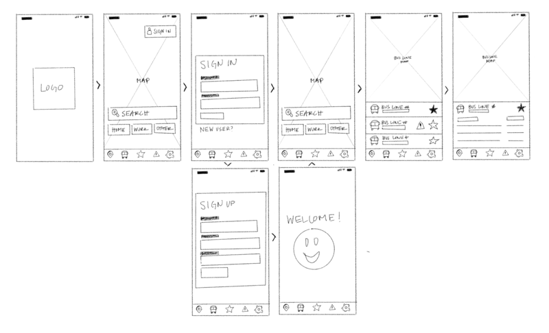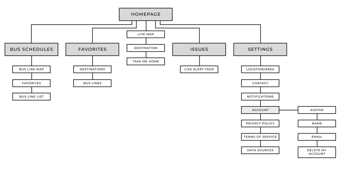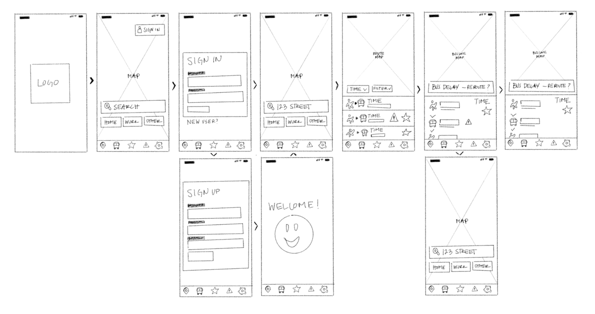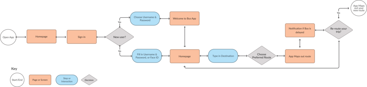 This second flow has a similar start, but diverges at the homepage where they search for a destination. They’ll type in their destination on the homepage, then be shown a variety of options. It’s here that they’ll choose their preferred route. If the bus is delayed they’ll be asked if they would like to be re-routed. If not, they’ll be sent back to the homepage where they can find the bus schedules and nearest bus stops.