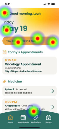 I conducted two types of usability testing: Remote via Maze and in-person tests. I tested 5 different tasks: create an account, view today's appointment, add a medication, add a doctor, and send an invite to a loved one.
