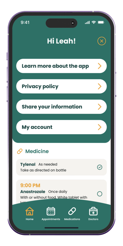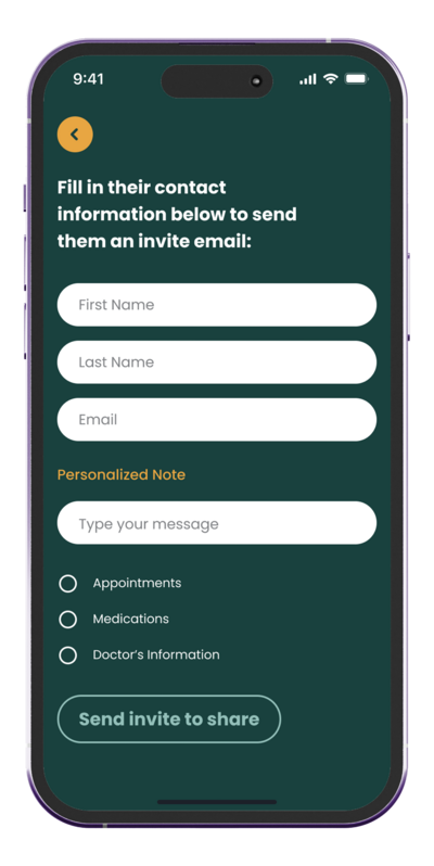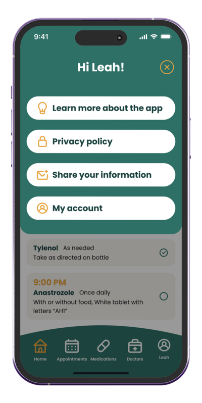 Once Leah fills in her treatment information, she'll access their account settings. Here Leah will be able share her medical information her daughter.